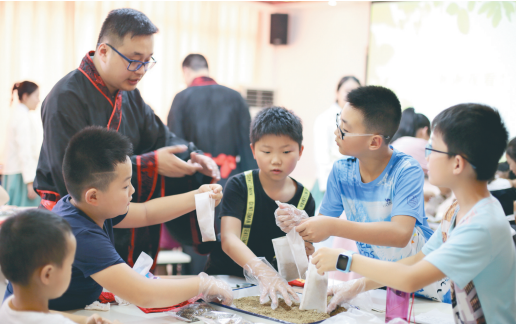 4位助教也协助学员们一起做驱蚊包,每位参加上课的学员,一人做了两个。细心的金湛老师还提醒学员,“驱蚊包的药效是一个月。带回家后告诉父母,驱蚊包千万别放在床头,因为这5味药中有醒脑的成分,会影响大脑休息。”
