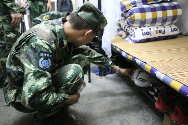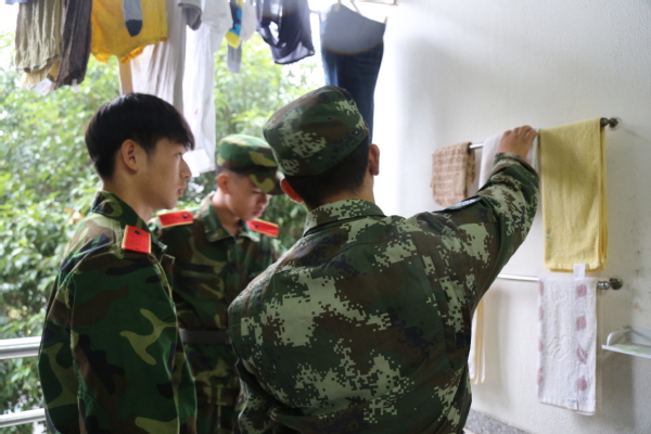 教官按军训内务规定对新生宿舍中被子的折叠和位置摆放、床铺的整理、生活用品和鞋子的规范摆放、室内卫生清洁程度提出了严格的要求。教官亲自示范,教新生们运用“压、折、挤、掏”等基本动作完成了被子从“大面包”变成了“豆腐块”的华丽转变。同时教官还详细讲解并示范了毛巾、杯子等日常用品的摆放位置和方法,衣柜中衣服从大件到小件摆放,衣服和裤子分开归类放置,还有书桌上书本从高到矮、方向一致摆放等等。整个过程中,新生们都表现得积极主动,认真求教,用心牢记着每一个动作与要领并感谢教官们教授的东西。