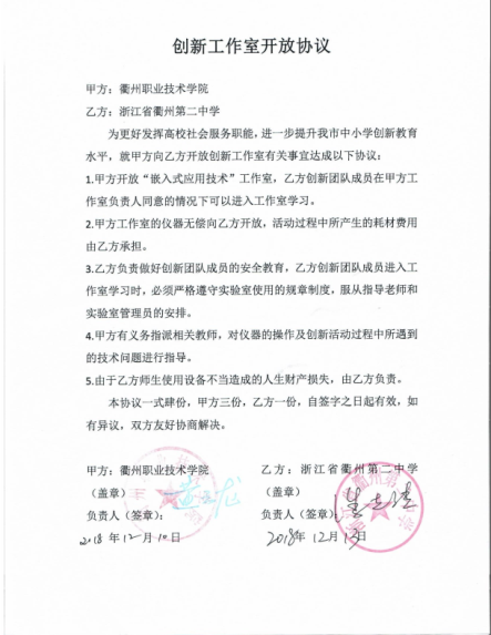 为更好发挥高校社会服务职能,推动我市青少年科技创新人才的培养,信息工程学院与浙江省衢州第二中学在青少年科技创新活动中开展了深入合作。信息工程学院创新工作室对衢州二中学子开放,中学生的创新点子不仅停留在脑海中,而且还可以在大学的创新工作室得以实现,这极大地促进了中学生科技创新的热情。
