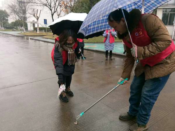学生党员冒着严寒和风雨在西安门大桥路口、冠发君悦路口、书院大桥路口进行志愿服务和文明劝导。党员教师从南大门出发,途经信息工程学院、风雨操场、机电大楼、小球馆、食堂、学生公寓,走遍校园的每个角落,共捡烟头三十余颗,垃圾少许。虽然天气恶劣,但是老师和学生们干劲十足,努力巩固创文成果,保持校园整洁。