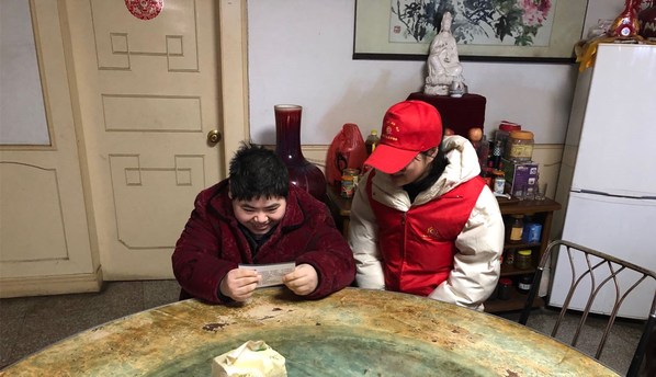 随后,“一缕阳光”协会的志愿者们如往常一样,到残疾人居家照料中心进行工疗和娱疗:给庇护中心的“憨豆儿”们讲故事,叫他们唱歌、学习、做手工等。