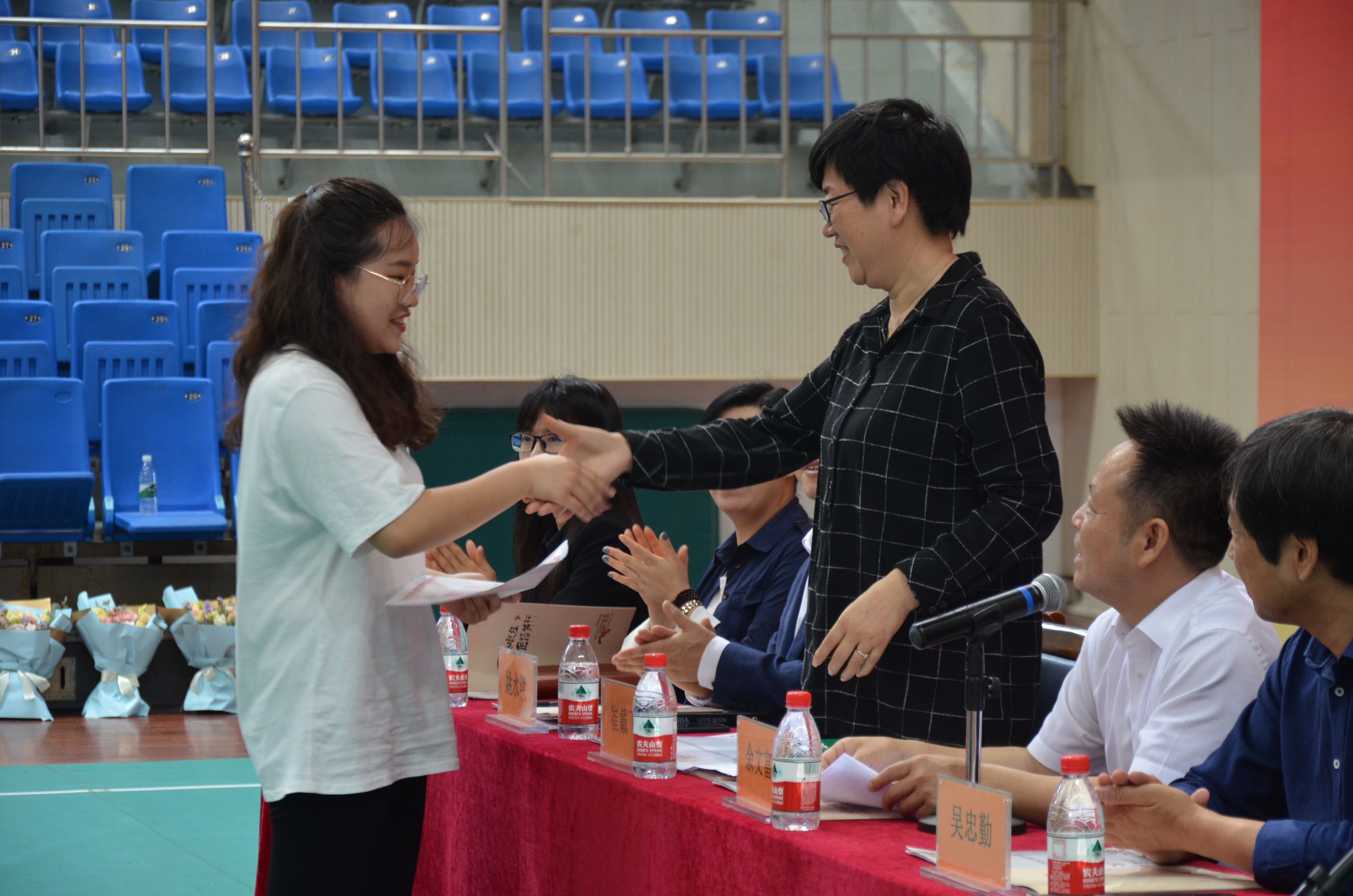 随后班主任们上台致毕业赠言,回忆这三年同学们的成长与进步,希望众学子坚定目标,心怀感恩,归来时仍是翩翩少年。毕业生代表为各班主任献花,场面温馨感人,将毕业典礼推向高潮。