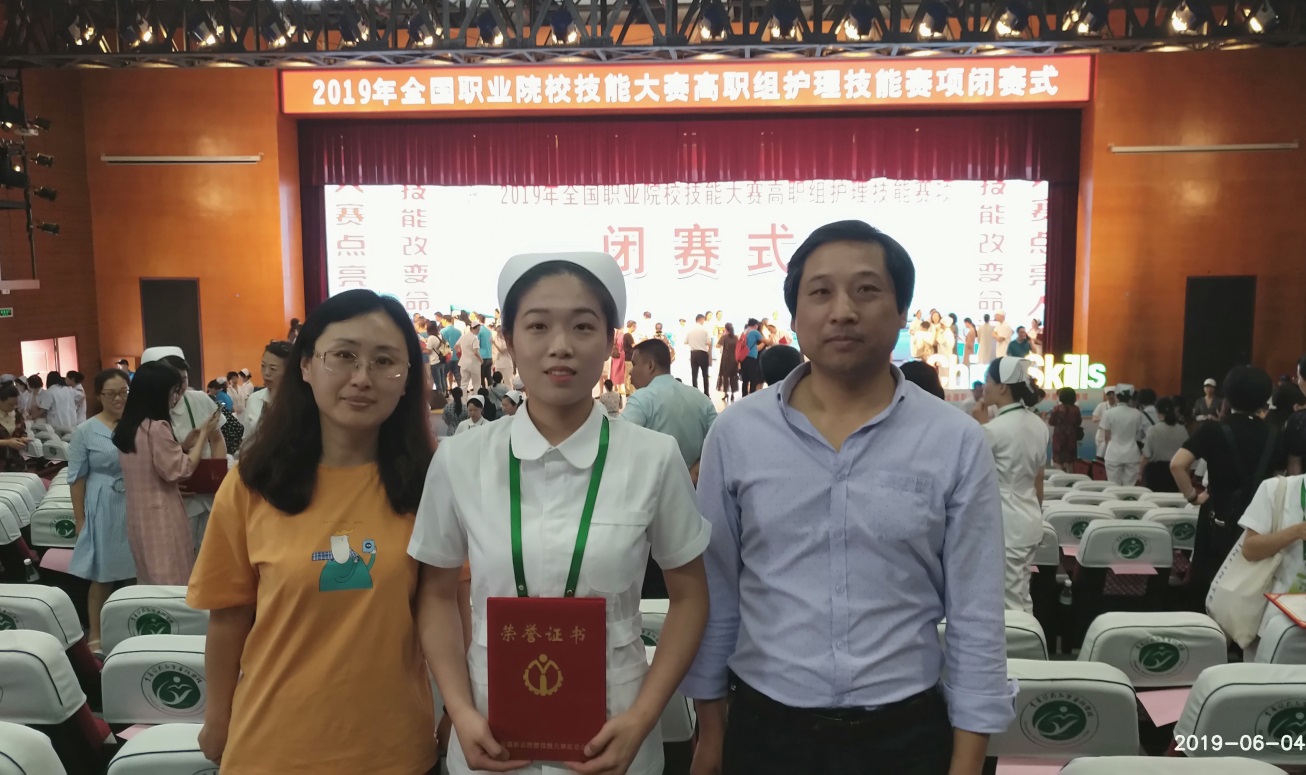 6月4日, 为期三天的2019年全国职业院校技能大赛高职组护理技能赛项在重庆医药高等专科学校落下帷幕。来自全国31个省、直辖市、自治区的143名选手参加本次竞赛。经过紧张的比拼,医学院护理专业蒋婷婷同学荣获个人总成绩三等奖。
