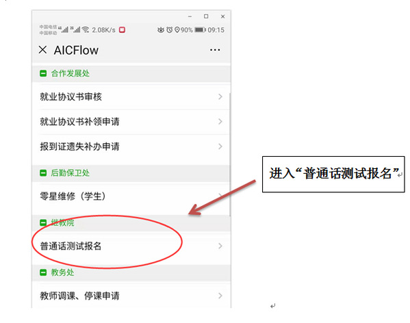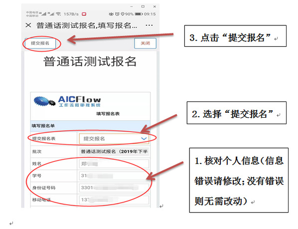 扫描二维码,关注“江南网页版智慧校园”公众号——通过 “学生服务”进入系统(账号为本人学号,密码为学号加字母a)——选择“网上办事大厅”——进入“普通话测试报名”——核对个人信息(如有错误,请修改),确认无误后选择“提交报名”——报名完成。(图示如下:)