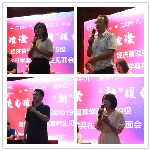 随后各专业主任和教学工作服务团队、新生班主任及学工办全体辅导员一一亮相,并送上热烈的欢迎和诚挚的祝福,鼓励同学们,满怀热情,坚定信念,学好专业知识,以饱满的姿态迎接美好的大学生活。