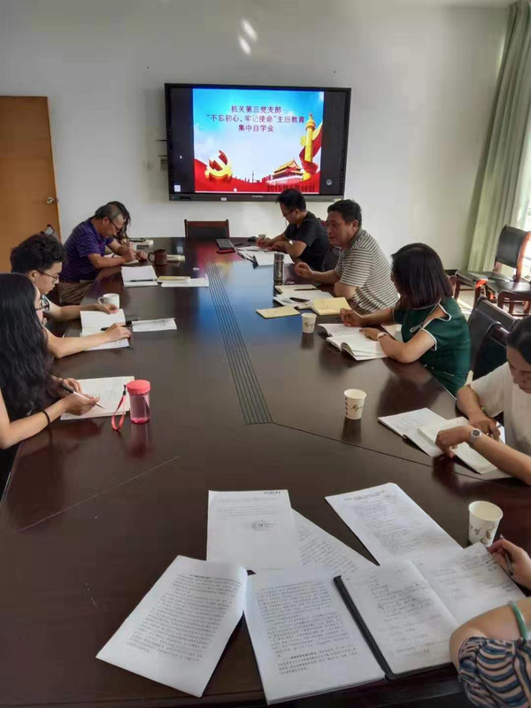 9月19日下午,机关第三党支部在行政楼8楼会议室召开“不忘初心、牢记使命”主题教育集中自学会。机关第三党支部代书记邵方益同志主持会议,支部全体党员、巡回督导组成员陈旭雯同志参加会议。