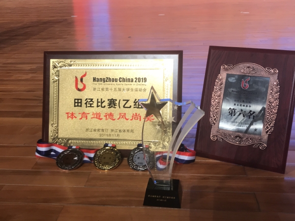 11月10日,浙江省第十五届大学生运动会在杭州师范大学圆满收官,本次大运会我校共参加了排球、羽毛球、健美操、武术、游泳、田径六个竞赛项目和一个阳光项目,共获得奖牌20枚,其中金牌14枚,银牌5枚,铜牌 3枚。同时,以团体总分第三名的优异成绩评为“校长杯”获奖单位。校党委副书记、校长江爱民出席闭幕式,并上台领奖。