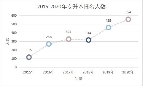 我校2020届预计毕业生人数为2167人,“专升本”报名人数占25.56%,比去年增加4.3%。可见,不管是“专升本”报名的绝对数还是占比都出现持续不断攀升的良好势头。这主要得益于我校的高度重视,与学校、二级学院的广泛宣传、科学组织密不可分。学生处通过始业教育、专场讲座、展板宣传、建立QQ群、微信公众号推送等方式,从新生入学起,就营造“专升本”氛围,引导、鼓励优秀学生积极报考“专升本”。在“专升本”志愿填报期间,学生处安排老师负责网上答疑,为学生提供报名指导、考试、志愿填报指导、政策讲解等相关服务,使每个专业的学生都有更多选择报考的学校。