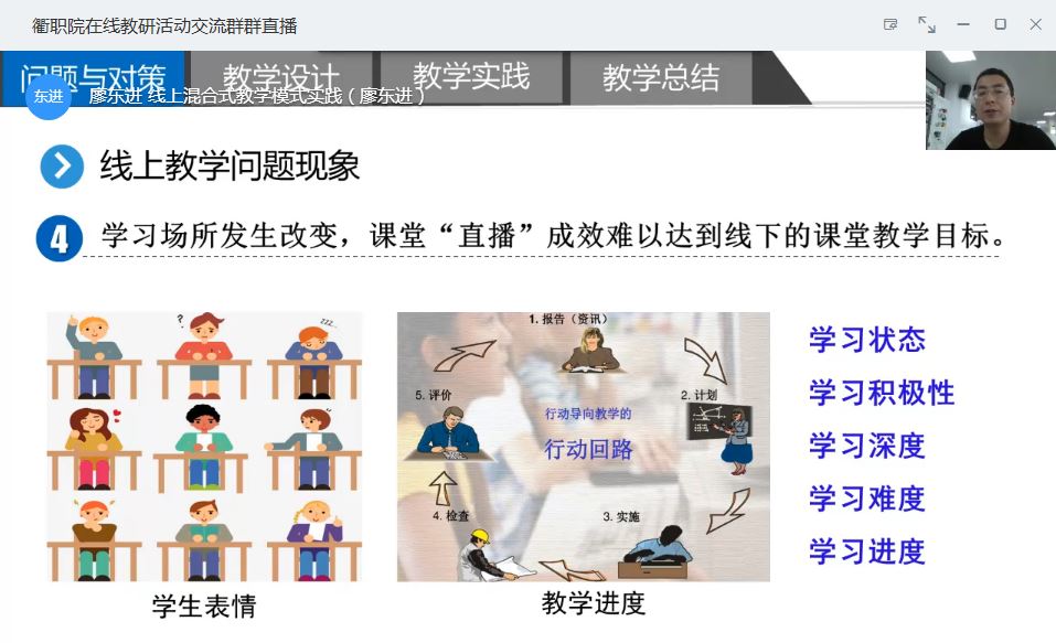 5月8日,第五期在线教研活动由信息工程学院副教授廖东进老师主讲,全校共132名教师参加活动。廖老师围绕“线上混合式教学模式实践——以《模拟电子线路分析与设计》课程为例”主题,从线上教学问题与对策、线上教学设计、线上混合式教学实践和线上混合式教学总结四个方面介绍了线上教学经验。随后,公共基础部凌源老师从驱动、促成和评价三个方面分享了英语课程产出导向法(POA)线上教学心得体会。