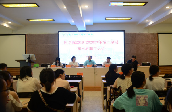 7月4日上午,医学院实训多功能厅召开期末教职工大会。医学院全体教职工参加了本次会议。会议由医学院院长姚水洪主持。