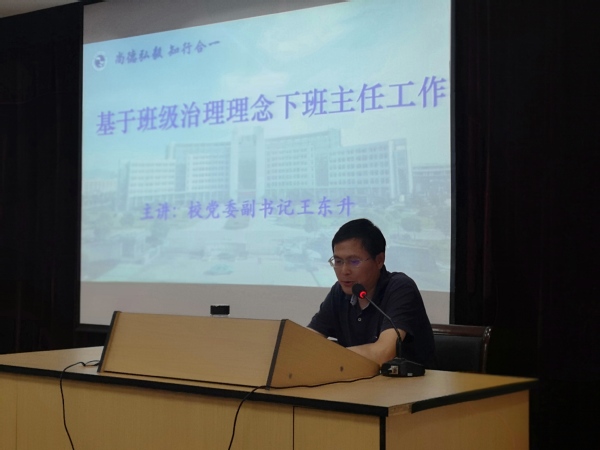 校党委副书记王东升在会上作专题报告,题为《基于班级治理背景下的班主任工作》,报告从班级治理的内涵、主要举措和基本要求三个方面阐述了新时代下班主任工作的新理念、新思路,并希望全体班主任、辅导员要讲政治、讲公正、讲奉献,抓好当下“三件事”即抓好新生联络服务工作、抓好新生基本情况摸排工作、抓好新生第一课,继续改进学校班风、学风、校风,推进立德树人重重落地。