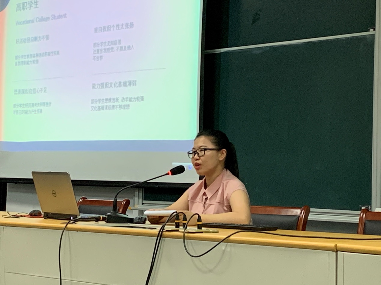 经济管理学院姜紫薇老师以“‘青椒’五日蜕变史”为题,从自我职业、高职学生、职业教育和专业教育四个方面汇报了新任教师岗前培训的心得体会。