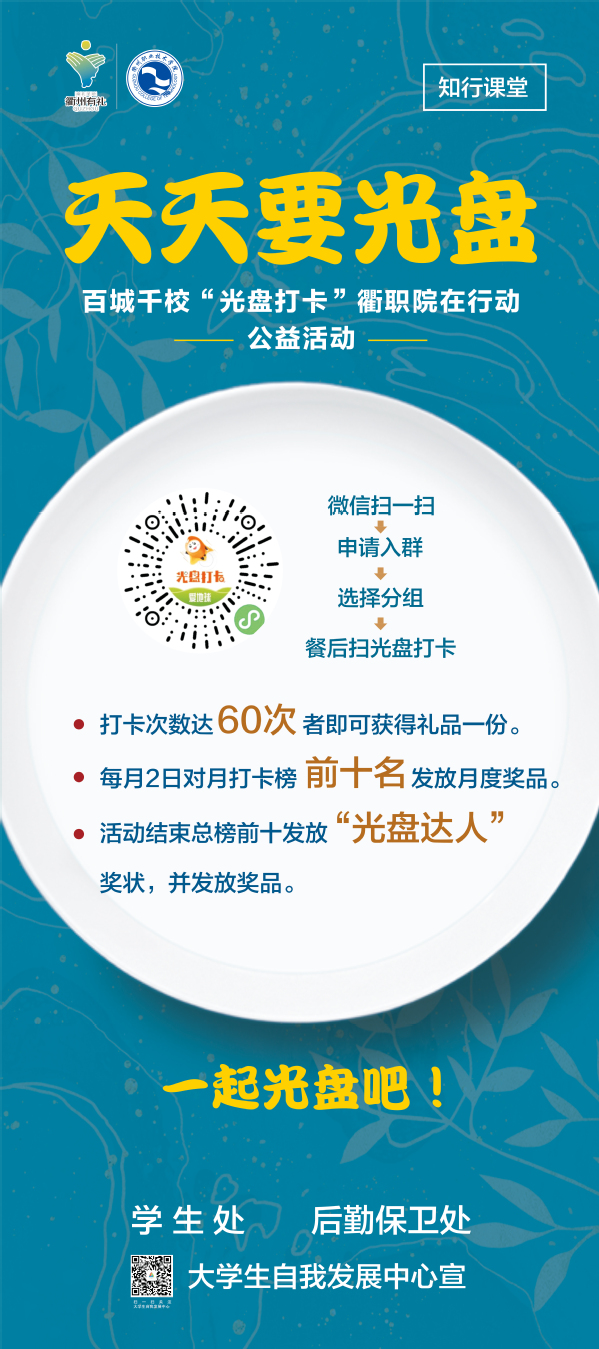 随着由学生处主办,大学生自我发展中心承办的“厉行节俭 反对浪费”主题教育活动的展开,全校师生首先将注意力放到了餐桌文明上来,一项公益活动光盘打卡小程序在师生中悄然流行开来。