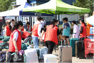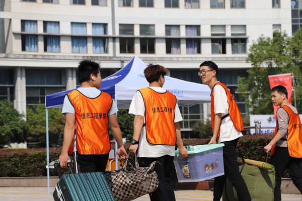 迎新工作如火如荼,到处都是忙碌的身影。在火车站、汽车站、学校南门、学生公寓,活跃着一群身着特色马甲背心的迎新志愿者们,他们争先恐后地接过沉甸甸的行李,指引新生测温、带到相应的报道点后,引导他们到寝室。