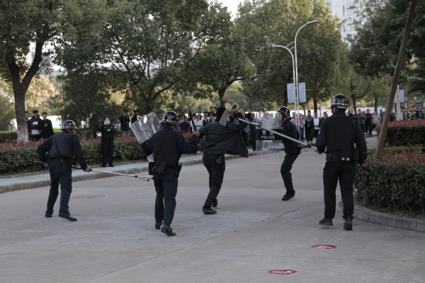 此次应急疏散综合演练以灭火、应急疏散、物资抢运 、反恐、电梯救援、防汛救灾、医疗救护等专项演练为主。反恐演练开始,嫌疑人携带管理刀具出现在三号楼西门时被保卫处治安巡逻队员发现,后勤保卫处值班室接到报警后,立即通知保卫人员赶赴现场处置,对犯罪嫌疑人进行控制,向后勤保卫处负责人和学校反恐防暴工作领导小组报告情况,启动反恐防恐工作预案,同时报告公安部门,后勤保卫处立即对现场进行警戒,控制嫌疑人,并将嫌疑人交由公安部门处置。