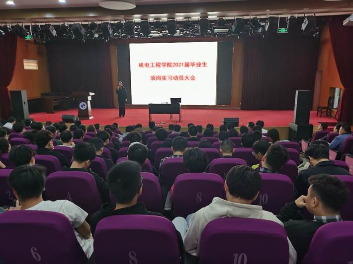10月29日,机电工程学院在一号报告厅举行了2021届毕业生顶岗实习动员大会。张玉贤副院长、各专业主任、辅导员李治丹、教学秘书张恩铭及机电工程学院全体2021届在校毕业生参加此次大会。