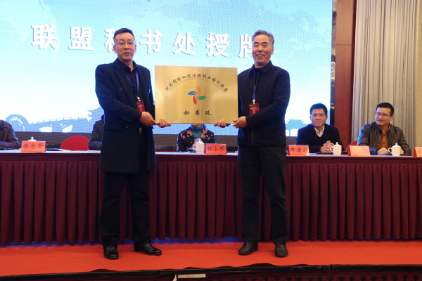 衢州市教育局副局长蒋志贤为联盟秘书处授牌,联盟秘书长徐荆上台接牌。