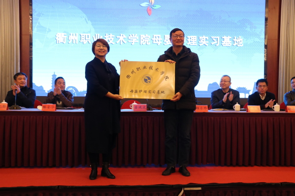 吕延文为馨月汇母婴专护服务(上海)有限公司授予“江南网页版母婴护理实习基地”的牌子。
