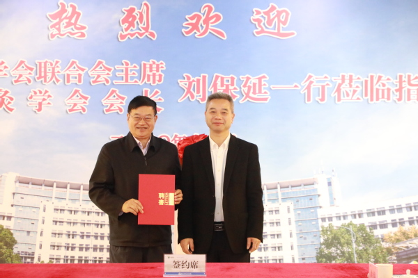 吴江平为刘保延颁发“杨继洲学院”名誉院长聘书。