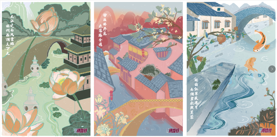 作品简介:作品主要表达的是风雅钱塘,百里画廊这样一个千年古韵的画面。作品的创意来源于白居易的《忆江南》。诗中描绘了 “日出江花红胜火,春来江水绿如蓝” 这样如此美丽的江南韵味,令人产生了一种身临其境的感觉,白居易在文中写道“能不忆江南”,那又怎能不去绘江南呢?作品采用插画的形式分别以杭州西湖嘉兴南湖绍兴东湖为原型,“小桥流水人家”、“江南花木四时荣,多少楼台烟雨中”是江南地区独有的风景,画面中的建筑,花卉,水系经过艺术手法的处理相互交融,错落有致,统一中具有变化,富有情趣。疏密相间,构图饱满,在创作过程运用了中国五大色系的配色方案,色调清新雅致,充满了诗情画意。