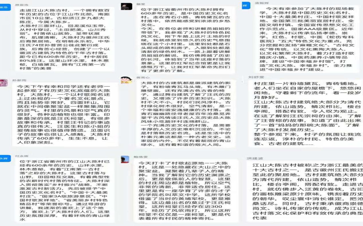 江山市大陈村是全国文明村镇、中国十大最美村庄、国家美丽宜居示范村、全国思想文化宣传工作示范点、中国村歌发祥地。同学们在我院的组织下,先后参观了中国工农红军北上抗日先遣队大陈村纪念馆、大陈村党建馆、汪氏宗祠等,感受到了红色文化、党史、传统文化等,让同学们真正理解文化软实力在乡村振兴中发挥重要的作用。参观结束后,同学们积极分享了自己的体会与感悟。