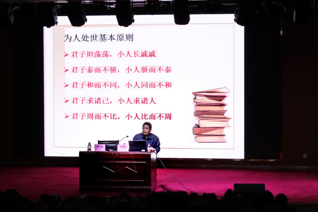 吴锡标教授以“孔氏南宗文化与大学生新时代行为习惯养成”为题,从孔子及其思想的历史地位、孔氏南宗的形成与发展、孔氏南宗的文化内涵与传承机制、孔氏南宗文化的历史实践、孔氏南宗文化的时代精神、南孔文化与新时代大学生人生修养六个方面为同学们带来精彩的讲述,让在座同学对南孔文化的现代价值有了全新的认识。讲座精彩纷呈,掌声不断,同学们获益匪浅。
