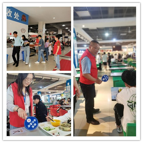 据悉,这是后勤保卫处党支部和经济管理学院党总支联合开展的主题党日活动——“制止餐饮浪费,餐桌文明劝导”志愿服务。每天中午就餐时段,党员同志们纷纷变身“红马甲”,向就餐师生宣传节约理念,劝导不文明用餐行为。党员同志率先垂范,教育引导就餐学生珍惜来之不易的粮食,真正将尊重劳动、珍惜粮食、反对浪费的意识内化于心、外化于行,用实际行动积极践行“光盘行动”。后勤保卫处党支部也向全校师生发出“厉行节约 反对浪费”的倡议,号召广大师生成为制止餐饮浪费行为的积极践行者和有力推动者。