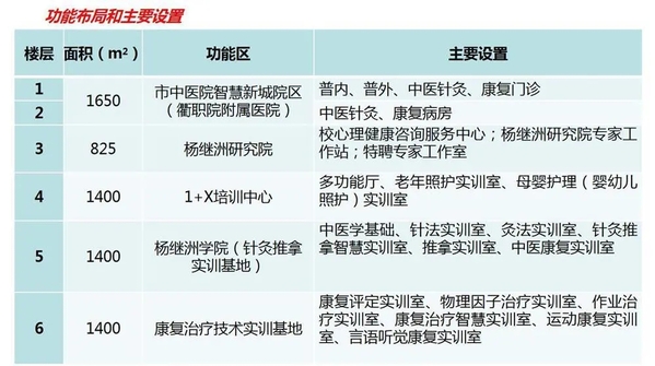 四省边际中心城市大健康公共实训中心分为市中医院智慧新城院区(衢职院附属医院)、杨继洲研究院、1+X培训中心、杨继洲学院(针灸推拿实训基地)和康复治疗技术实训基地六大功能区,将提供专业医疗、中医养生、康复保健、慢病管理等医护康养一体化服务。