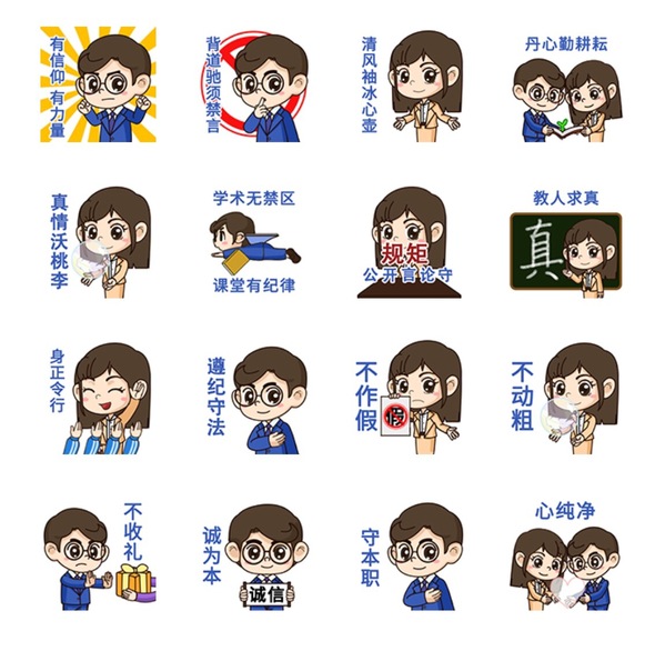 为打破廉洁宣传教育给人的传统刻板印象,江南网页版探索创新,从习近平总书记关于“四有好老师”、“四个引路人”、“四个相统一”重要讲话精神和《新时代高校教师职业行为十项准则》等中提炼精神内核,推出廉洁从教IP形象——“清清”和“莲莲”,并制作”清莲衢职”表情包发布推广,以更加生动的方式强化纪律规矩意识,增强廉洁教育的亲近感。