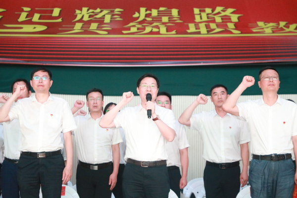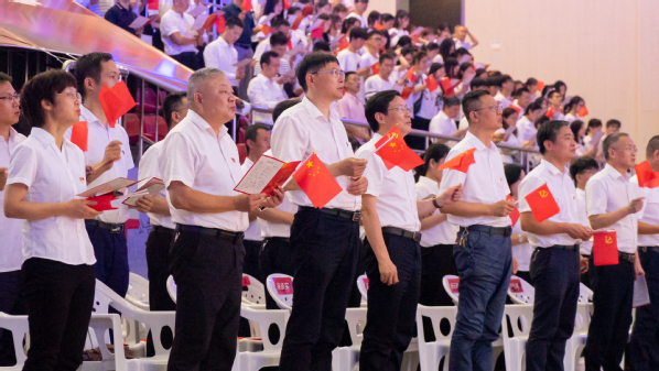 晚会现场,在党委书记徐须实的领誓下,全体党员一起重温了入党誓词。
