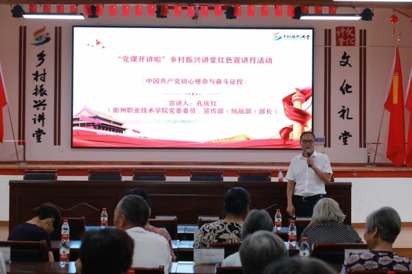 7月8日,校党委委员、宣传部(统战部)部长孔庆红带领马克思主义学院相关教师来到柯城区万田乡上蒋村的乡村振兴讲堂。孔庆红以《中国共产党初心使命与奋斗征程》为题,为村里的党员干部群众带来一场振奋人心的红色宣讲。宣讲以时间为主轴,结合中国共产党在各个发展阶段的探索、斗争、建设和重大事件,深入浅出、条分缕析地讲述了中国共产党的非凡发展历程,讲述了从发展历程中取得的种种经验和教训。并从中国共产党的发展历程、中外政党的执政理念对比中,让广大村民进一步提升了对党的认知、对党的感情,深刻认识到只有共产党才能救中国,更加坚定了永远跟党走的决心。