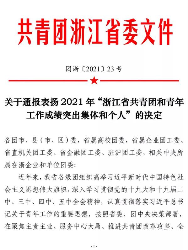 近日,共青团浙江省委通报表扬2021年“浙江省共青团和青年工作成绩突出集体和个人”,我校机电工程学院19级学生徐飞获评“成绩突出共青团员”。