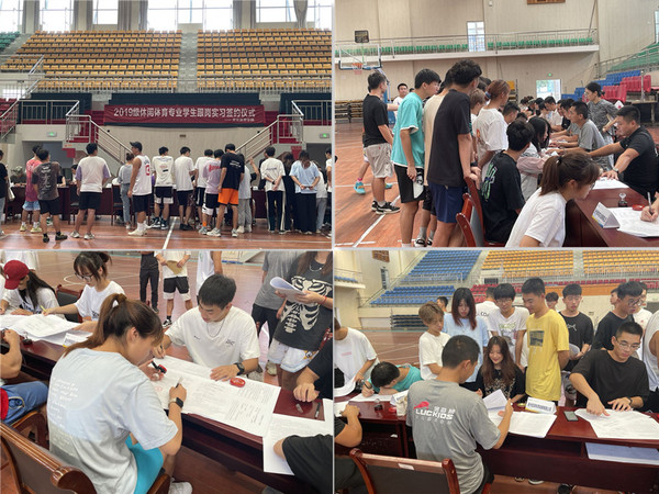 最后各企业代表在体育馆与2019级休闲体育专业学生进行交流,双方签订跟岗实习三方协议书。