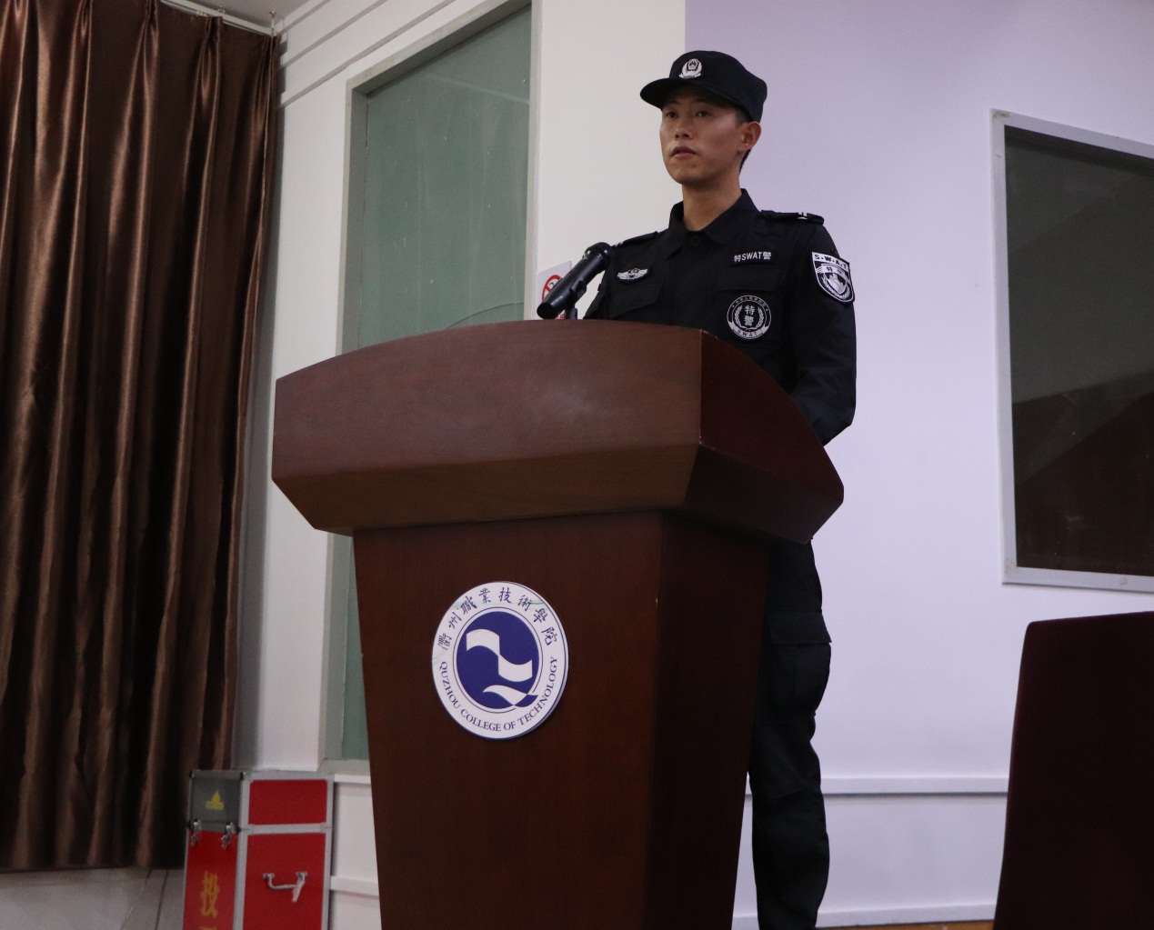 市公安局政治部副主任徐俊刚作动员讲话。徐主任阐述了校警双方设立“辅警班”的原因,介绍了辅警的工资待遇、职业发展、招聘条件以及我校学生的优势,他期望接下来能扩大“辅警班”招生规模,建立联络员机制,定期组织交流会议,保证校警双方合作顺畅。