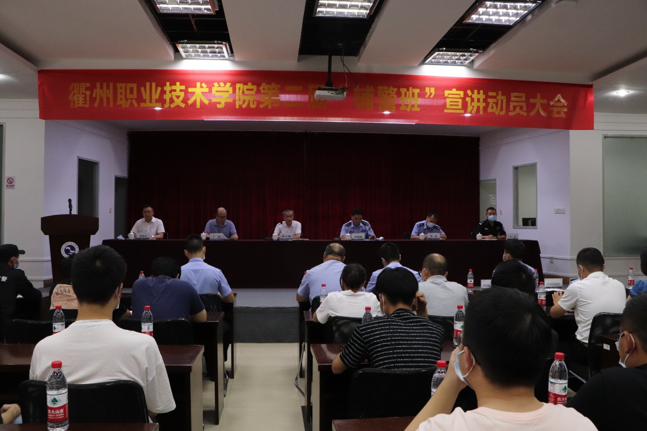 为进一步加强校警双方合作,提高学生对辅警工作光荣使命和重要意义的理解和认同,全力做好第二届“辅警班”组建和培养工作,推进专业化和规范化的辅警队伍建设, 9月17日下午,我校在艺术楼多功能厅召开第二届“辅警班”宣传动员大会。衢州市公安局政治部、干部处、教育培训处、特警支队等部门相关领导,副校长何百通、教务处、学工处、科学研究与社会合作处相关领导、各二级学院相关领导、辅导员和学生代表参加动员大会,会议由教务处处长王建主持。