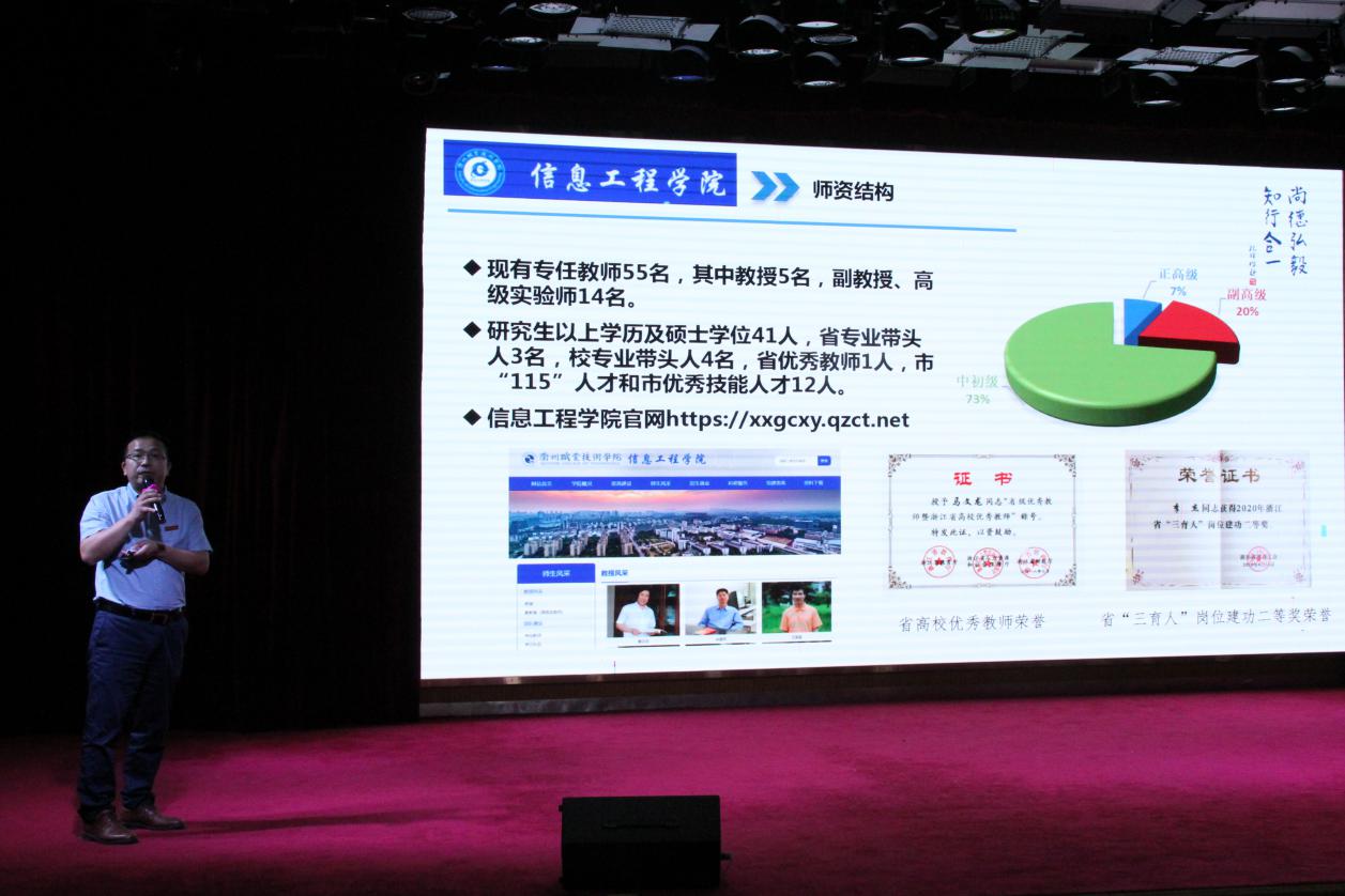 马文龙教授追溯了学院的发展历史,并围绕办学理念、师资结构、专业建设、教学改革和技能竞赛等方面向同学们概述了新时代信息工程学院改革创新历程。他说,学院发展正处在承前启后的关键时期,机不可失、时不我待,希望全体新生共同筑梦,成为“数字工匠”。