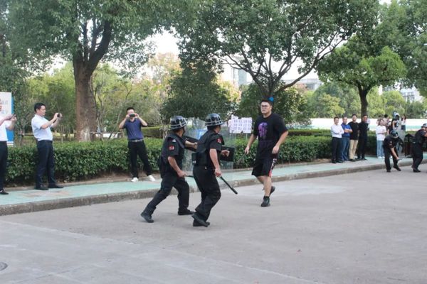 首先进行的是反恐演练,嫌疑人携带管理刀具出现在三号楼西门时被治安巡逻队员发现,值班室接到报警后,立即通知保卫人员赶赴现场处置,对犯罪嫌疑人进行控制,随后向后勤保卫处负责人和学校反恐防暴工作领导小组报告情况,启动反恐防恐工作预案,同时报告公安部门,后勤保卫处立即对现场进行警戒,控制嫌疑人,并将嫌疑人交由公安特警处置。