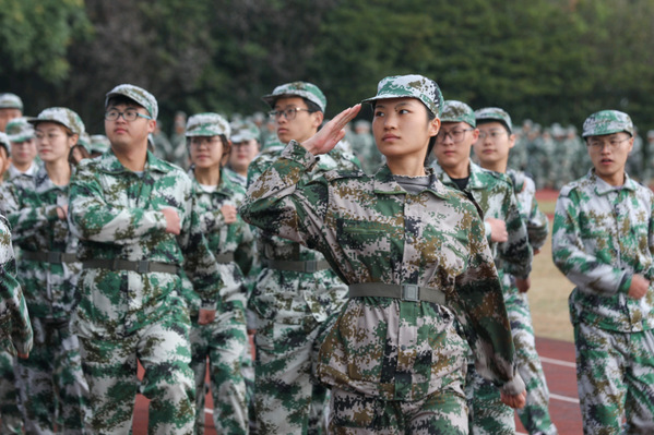 8时30分,在庄严的升国旗仪式后,来自6个连队的2200余名2021级新生军姿挺拔、精神抖擞,踏着激昂的旋律,以饱满的热情和昂扬的斗志依次从主席台前走过,接受检阅。汇报演出中,军训连队分别进行了分列式、女生匕首操、男生军体拳等表演。