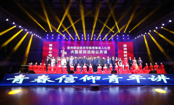 为深入学习贯彻习近平总书记在庆祝中国共产党成立100周年大会上的重要讲话精神和党的十九届六中全会精神,推动习近平新时代中国特色社会主义思想进教材、进课堂、进头脑。11月22日晚,2021级新生青春成人礼暨大型思政活动公开课在校体育馆隆重举行,本次活动由校党委宣传部和校团委联合举办。全体校领导、教师代表以及全校2000余名21级新生共同见证了本场青春盛典,衢州市委常委、宣传部部长钱伟刚应邀出席。