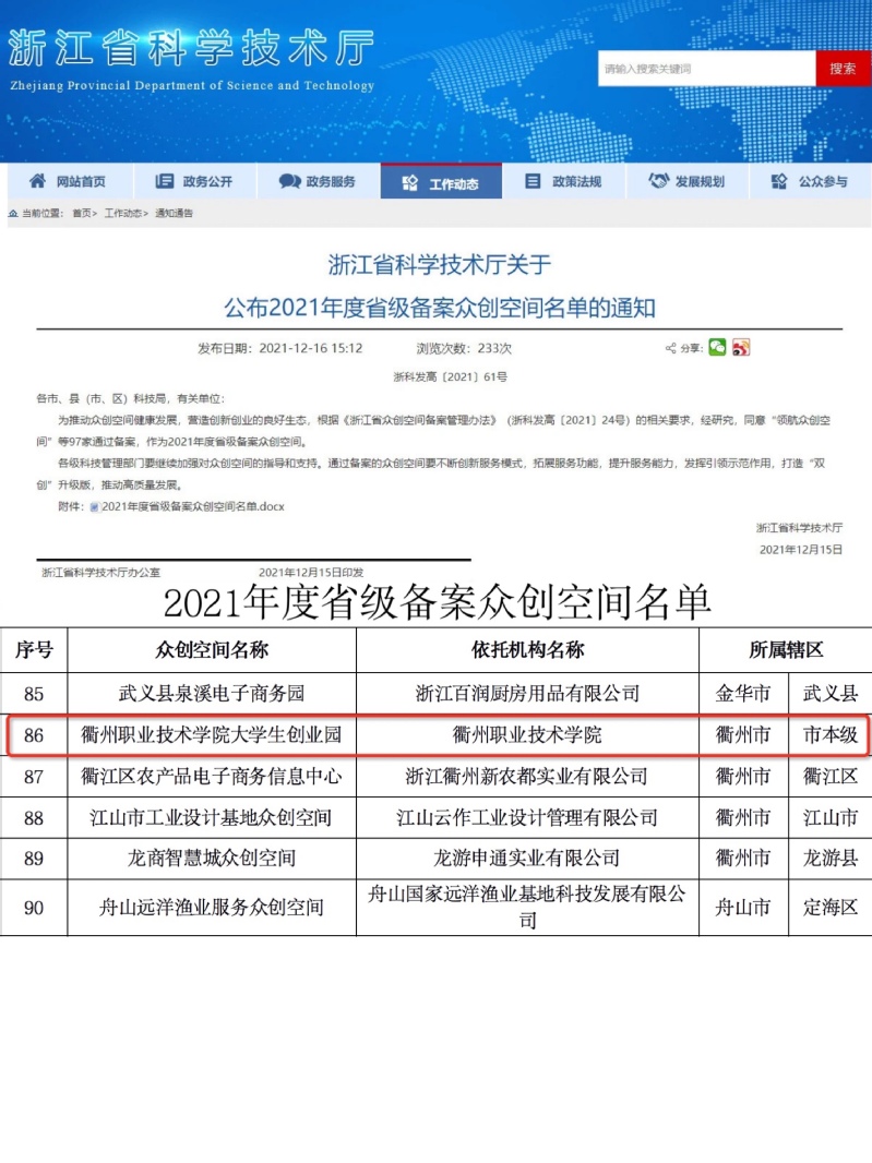 近日,浙江省科学技术厅官网公布2021年度省级备案众创空间名单,江南网页版大学生创业园榜上有名,这是继今年上半年获评市级创业园后,在一年内取得的另一成绩,成功跻身省级众创空间。