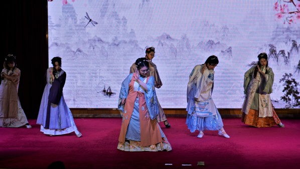 选手们悉数亮相完毕后,由校汉服社带来舞蹈表演《烟雨行舟》,带领观众体验烟雨入江南、山水如墨染的优美意境。