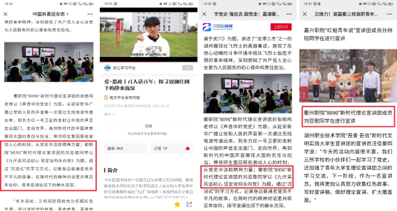 同时,刘亚歌作为学校“00”新时代理论宣讲员,带着由自己采访到的老党员红色故事撰写成的宣讲稿走近“红领巾”,走向特教学子,走到田间地头,以青春力量传播党的声音,努力让党的伟大精神在九仟采风中,薪火相传,生生不息。采风和宣讲事迹两度登上《中国共青团》杂志,还被新华网、学习强国,《衢州日报》等国家、省、市各级媒体累计报道20余次,引起社会广泛关注。