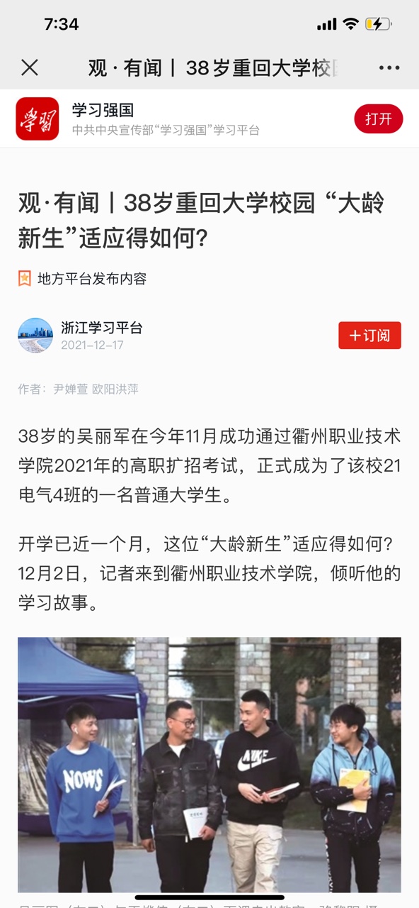 38岁的吴丽军在今年11月成功通过江南网页版2021年的高职扩招考试,正式成为了该校21电气4班的一名普通大学生。