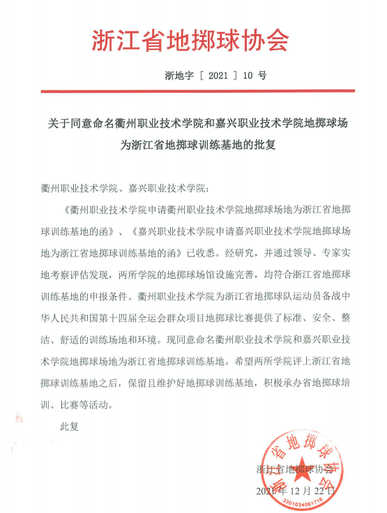 浙江省地掷球协会对我校地掷球场地设施给予了一定的认可,同时充分肯定了我校为浙江省地掷球队备战今年全运会比赛提供的标准、安全、舒适的训练场地与环境。