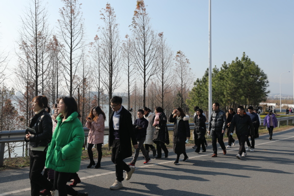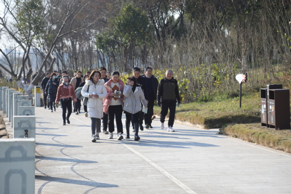 沐浴着冬日的暖阳,教职工们精神抖擞,由学校南大门出发,沿信安湖湖滨向北行进,沿途经过学校东大门、衢州学院操场东边围墙、浮桥、信安湖湖滨绿道、姚家堤区域导览牌、浮石古渡(打卡点1)、浮石二桥、信安阁(打卡点2)、书院大桥、学校东门的路线,一路欣赏冬日美景,一路畅谈新的一年工作愿景,充满着欢乐与活力。