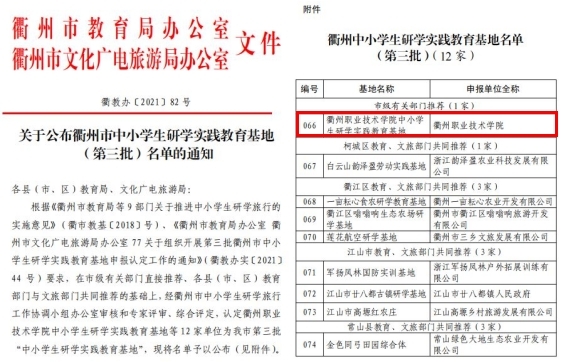 根据衢州市教育局办公室和衢州市文化广电旅游局办公室联合发布的《关于公布衢州市中小学研学实践教育基地(第三批)名单的通知》,我校被认定为“衢州市中小学研学实践教育基地”。