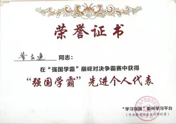 近日,“学习强国”衢州学习平台上线仪式暨“强国学霸”巅峰对决争霸赛活动在衢州日报报业传媒集团二楼新闻发布厅举行,经过激烈角逐,我校马克思主义学院董友建老师所属队伍获“学习强国”衢州学习平台“强国学霸”巅峰对决争霸赛王者战队称号,个人获得“强国学霸”先进个人代表荣誉称号。