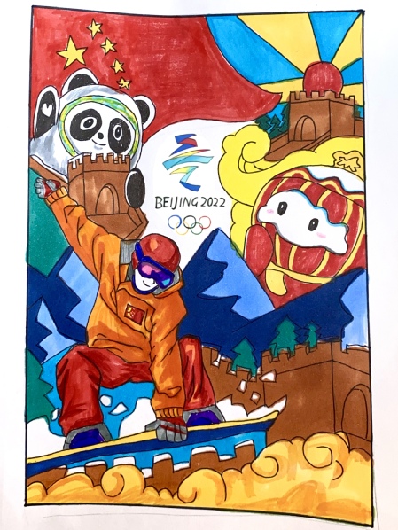 作品简介:以冬奥会为主题构思的设计,主视觉采用滑雪人物的大动态,作为视觉主体,雪容融冰墩墩作为辅助元素,长城作为背景贯穿画面,来表现积极向上,同向未来的主题思想。