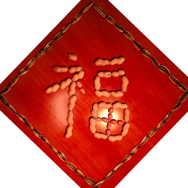 作品简介:使用具有代表性的年货组成寓意吉祥,“福”字,背景使用传统的红色,寓意红红火火,瓜子也被当做“银子”,表示财运围绕,画面中心由花生组成,寓意健康长寿。由花生占中心部分也代表健康是第一位,总体代表在新的一年福气满满。