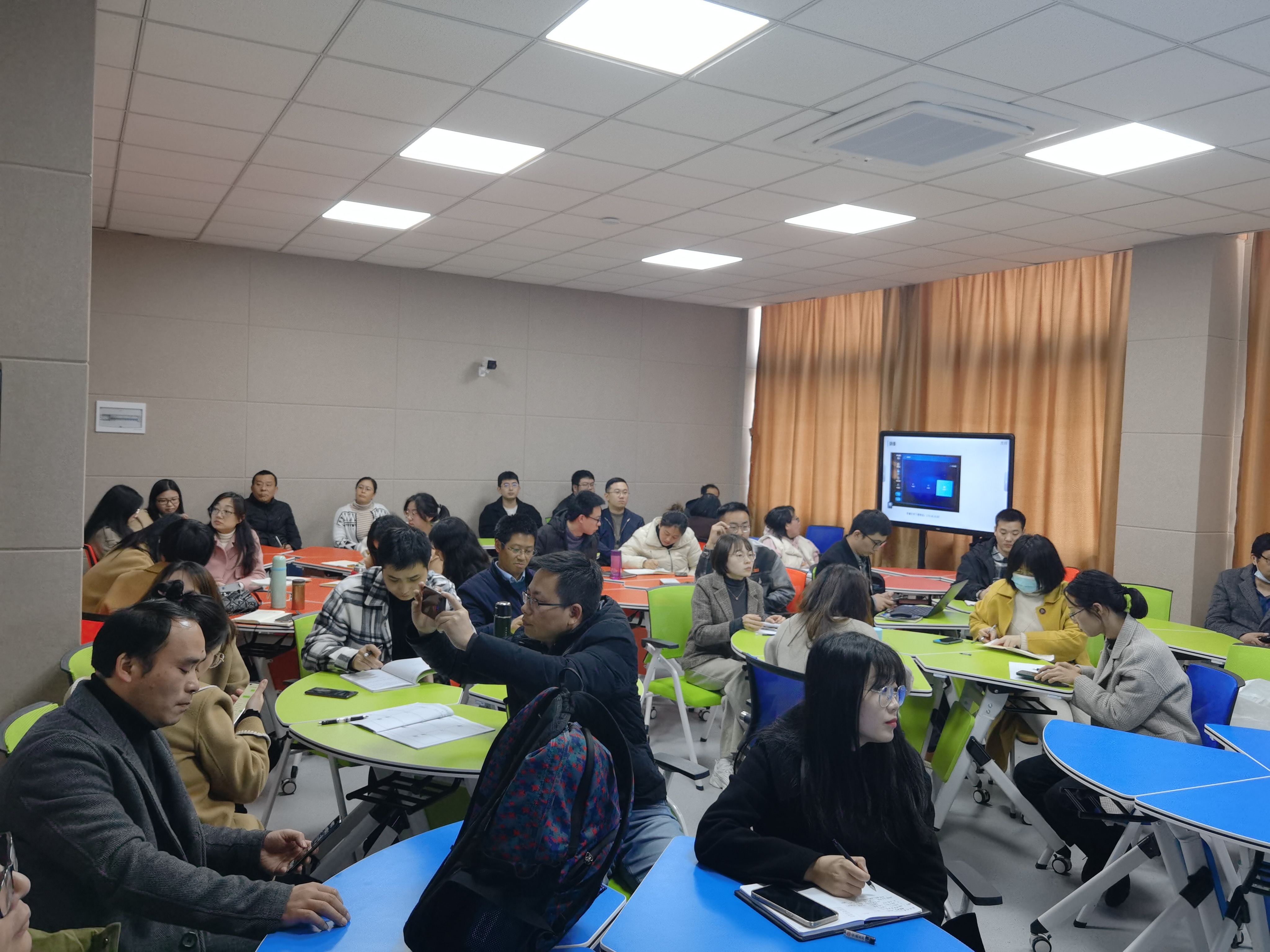 培训老师分别介绍了智慧教室设备设施的使用操作方法及使用技巧,包括智能控制中心、交互式智能平板、物联网控制系统等内容。在培训过程中教师积极参与互动,演练多屏协作、无线投屏、师生互动等功能的使用技巧。